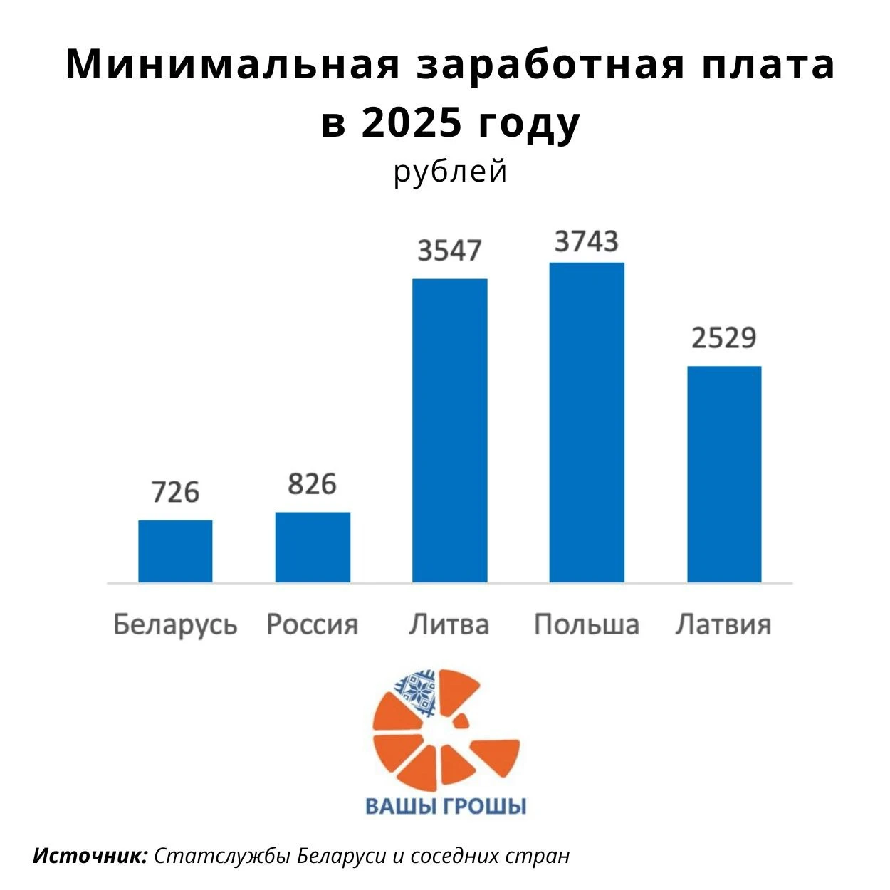 В текущем 2025 году беларуская «минималка» равна 726 рублям в месяц. При этом в РФ минимальная зарплата в пересчете на беларуские рубли — 826 рублей. А в странах-соседках, входящий в Евросоюз, в несколько раз выше: в Латвии работающие на «минималках» получают в эквиваленте около 2529 беларуских рублей, в Литве — 3547, в Польше — 3743. Или почти в 3,5—5 раз больше.