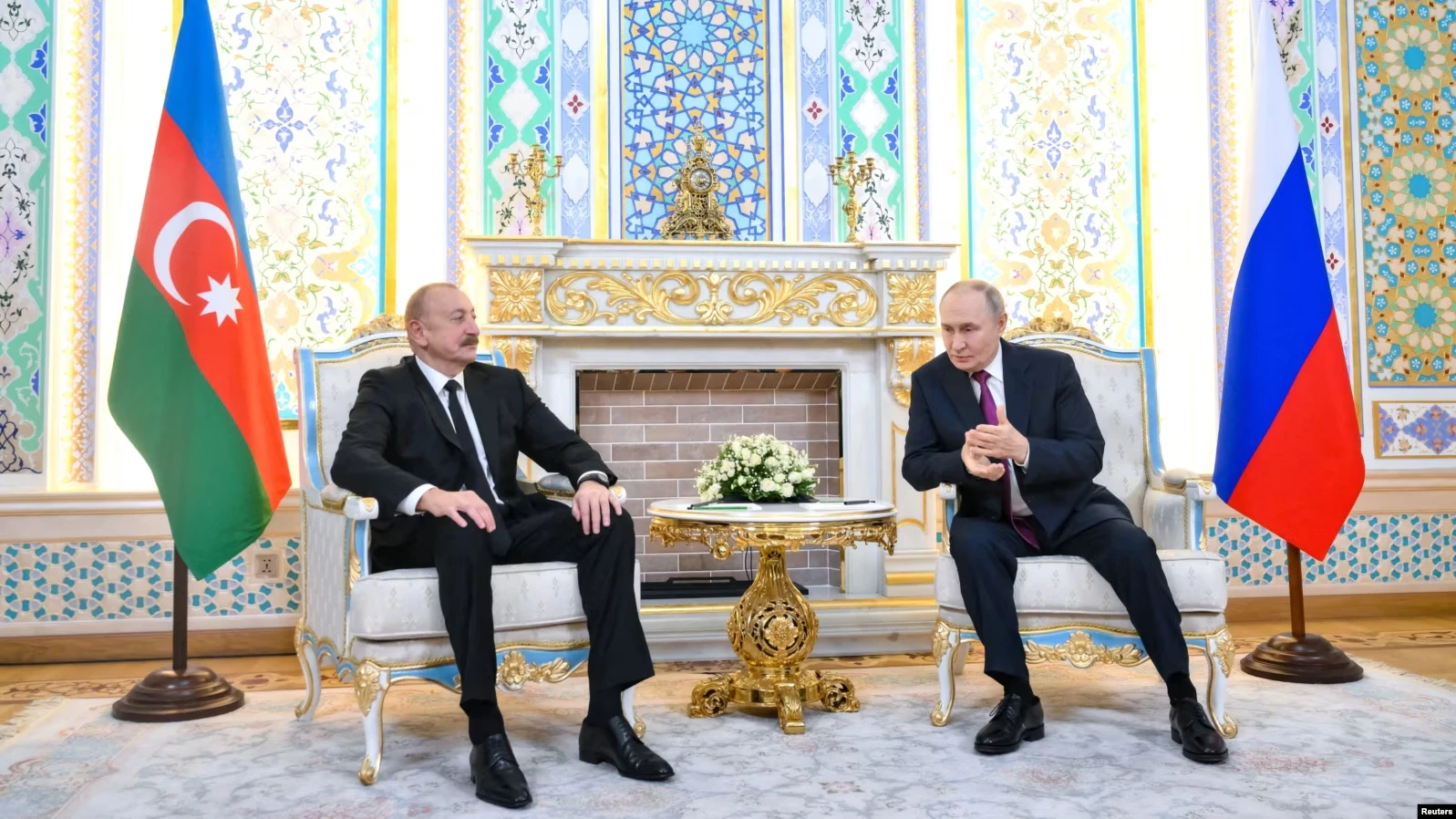 Но на встрече с азербайджанским правителем Ильхамом Алиевым уже Владимир Путин оказался в довольно унизительной ситуации, на что указывает положение тел собеседников. «Хан» из Баку свысока поглядывает на вынужденного извиняться и оправдываться «хозяина Кремля».