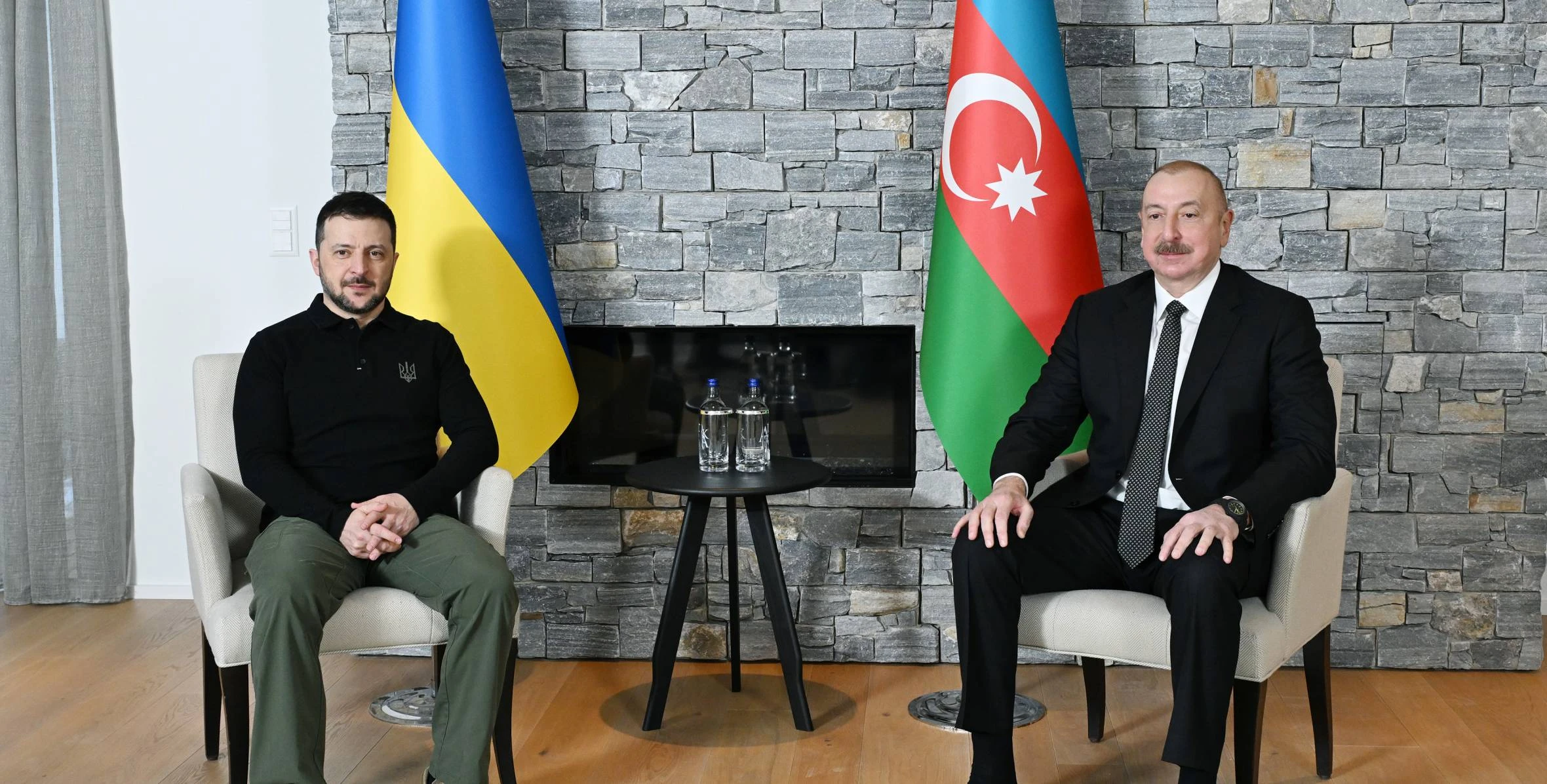 А вот как во время переговоров с тем же Ильхамом Алиевым выглядел украинский президент Владимир Зеленский. На этом фото мы видим двух равноправных собеседников.