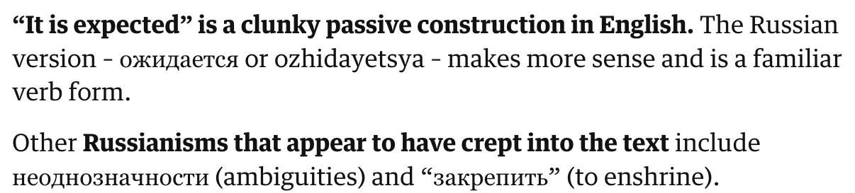 В частности, фраза «It is expected» (Ожидается), использованная в пункте о том, что «Россия не будет вторгаться в соседние страны», названа неуклюжей пассивной конструкцией и прямым переводом русского слова «ожидается». Также в тексте замечены другие русизмы: ambiguities (неоднозначности) и to enshrine (закрепить).