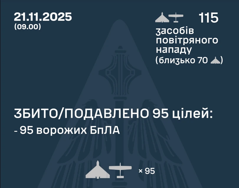 В ночь на 21 ноября Россия атаковала Украину 115 ударными беспилотниками, ПВО обезвредила 95 из них.